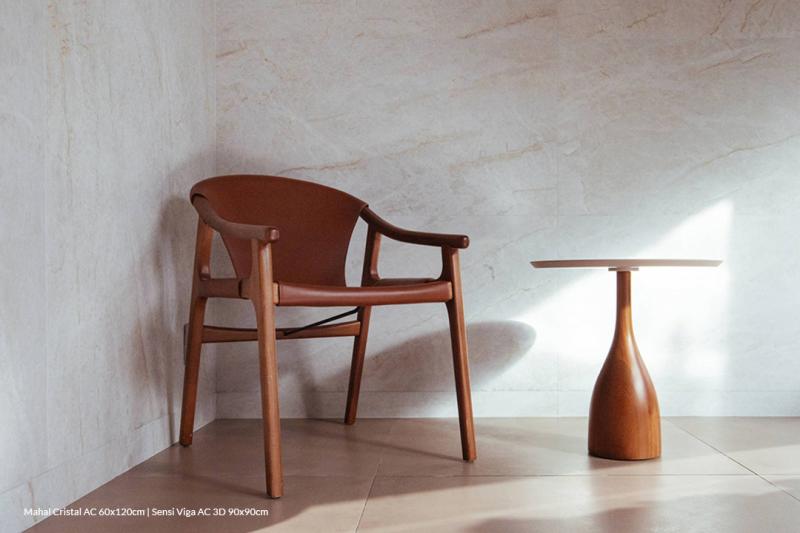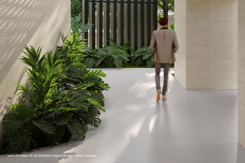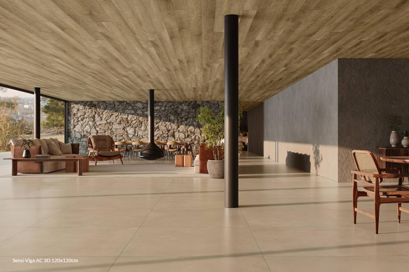 É nesse contexto que a série Sensi se destaca. Com design arrojado e uma estética que equilibra rusticidade e contemporaneidade, ela traduz o potencial dos grandes formatos aliados à tecnologia. Sua superfície destonalizada, enriquecida por efeitos digitais, cria profundidade visual e uma experiência tátil marcante.